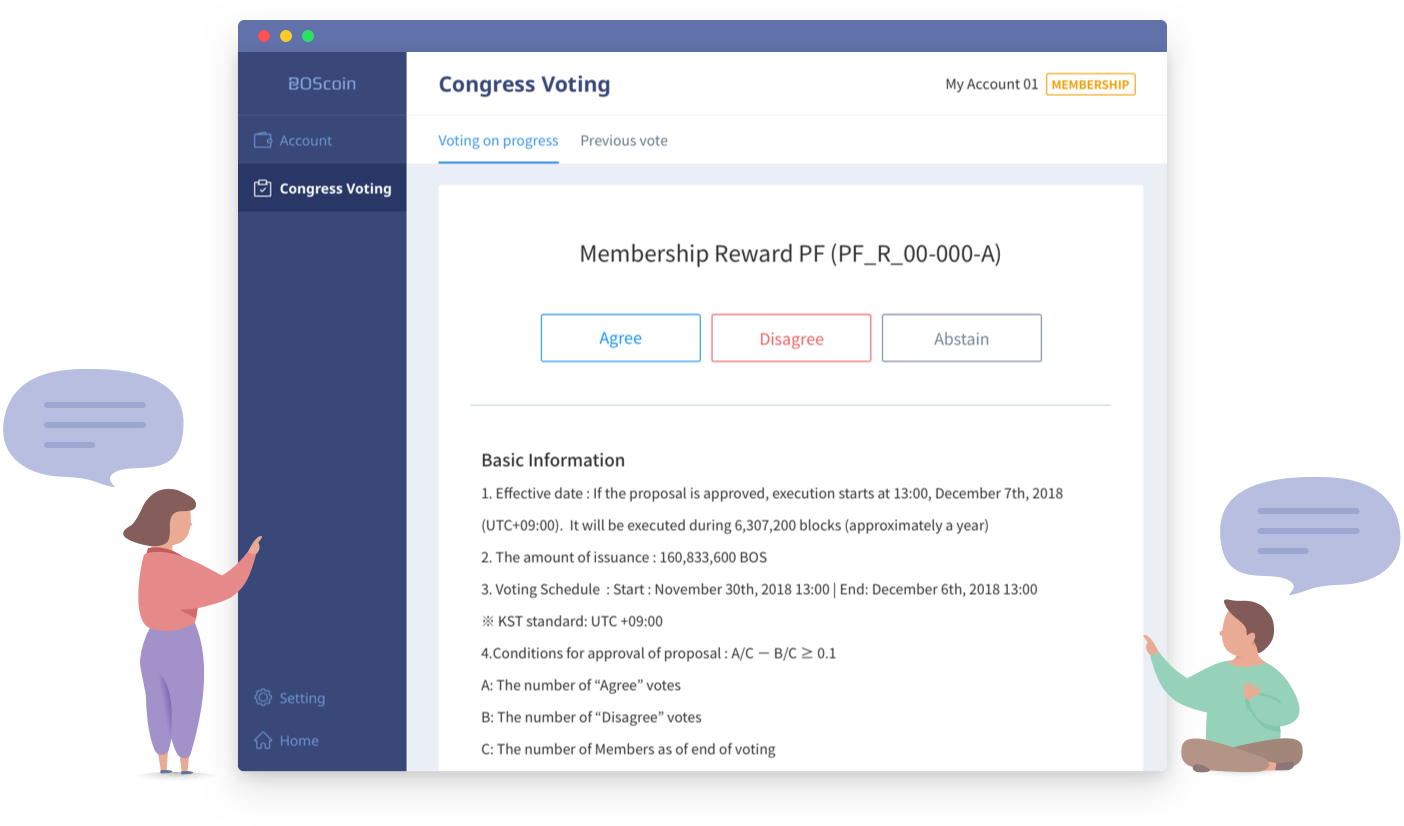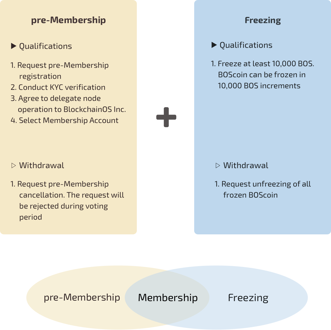 - User receives Membership after completing pre-Membership requirements and freezing at least 10,000 BOScoin. Any BOScoin wallet address can be designated as a Membership account. Designation is for voting and BOScoin freezing.