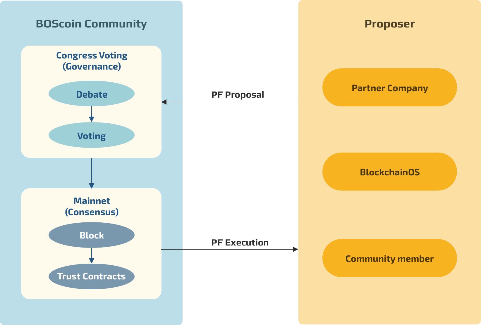 - Any BOScoin community member can propose PF. However, only BlockchainOS will submit proposals for PF until the platform is stable.