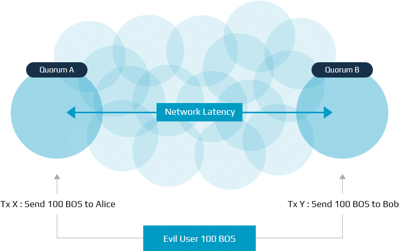 In reality, nodes and it’s quorums can be located far away in terms of network latency. This matter prevents the message to be broadcasted to the entire network simultaneously. Safety [2] can fail at this point. Let us assume that an evil user has 100 BOS and the user attempts to send 100 BOS to 2 people at the same time. In an ideal environment where network latency is zero, only one payment will succeed and the other will be rejected. The confirmed payment will be recorded in the blockchain forever. However in reality where there is network latency, double spending could potentially occur and bring the network down. Consider the following environment: