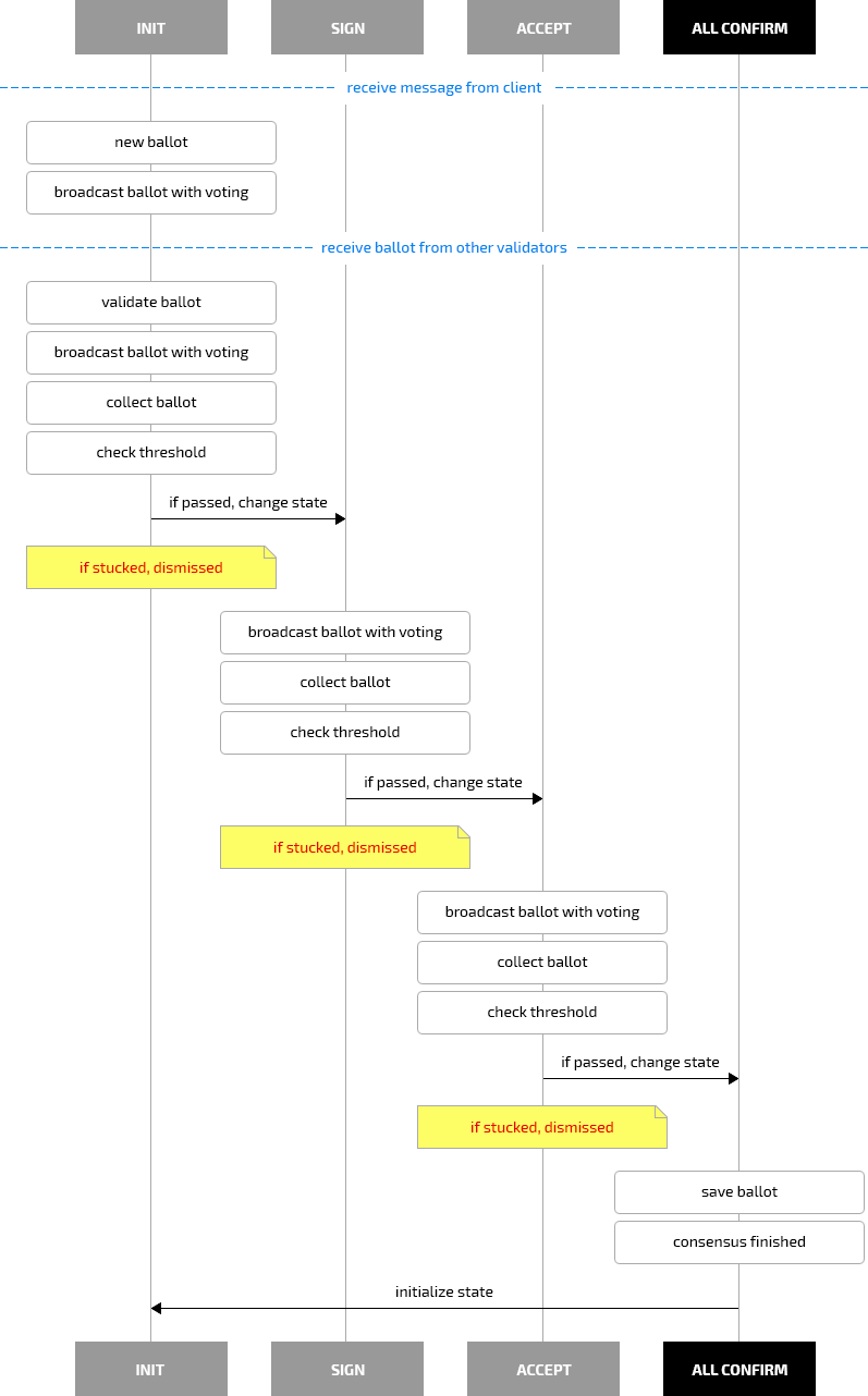Each ballot will be processed and validated through 4 states. INIT -> SIGN -> ACCEPT -> ALL - CONFIRM